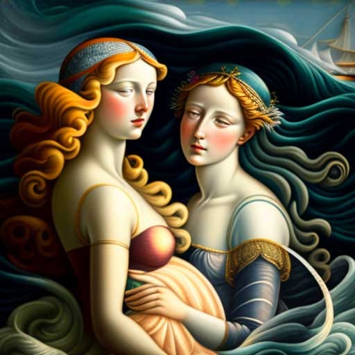 Sandro Botticelli — nautical scene in the style of Sandro Botticelli’s Birth of Venus, mystical, light and bright