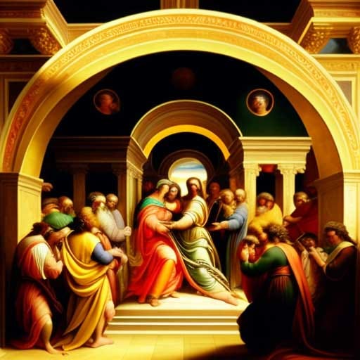 Raphael — in the style of Raphael’s School of Athens fresco painting, colored illustration, light and bright, gathering of people, gold, arches