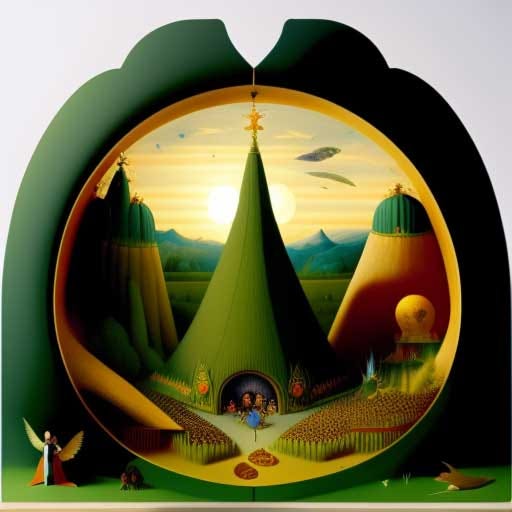 Hieronymus Bosch — fantasy scene of a rock concert in the style of the Garden of Earthly Delights by Hieronymus Bosch, bright sunlight